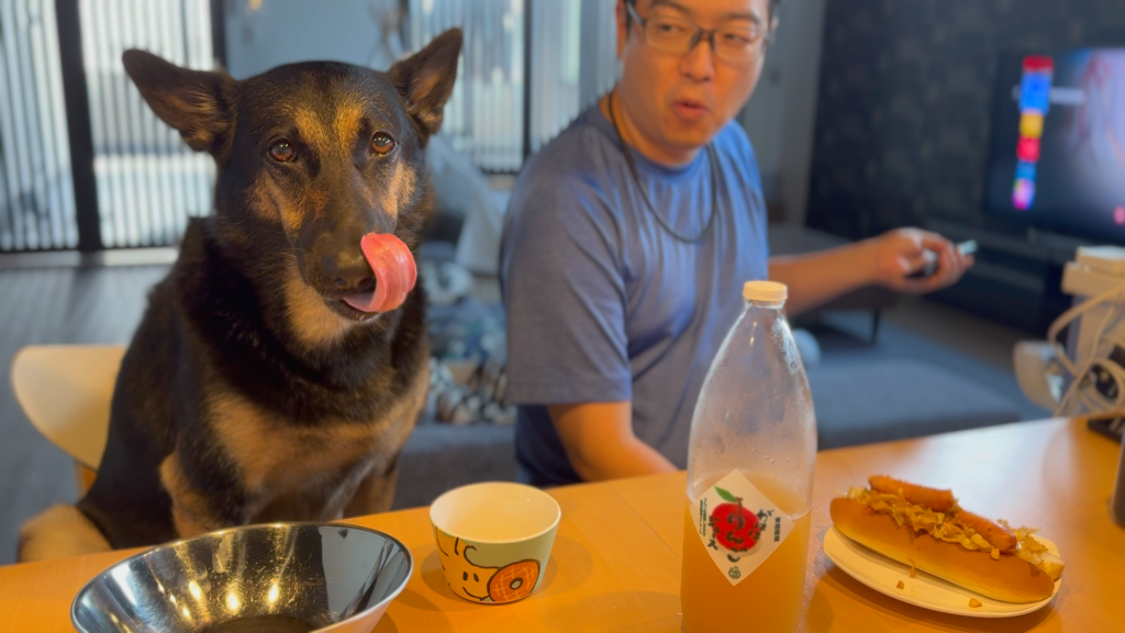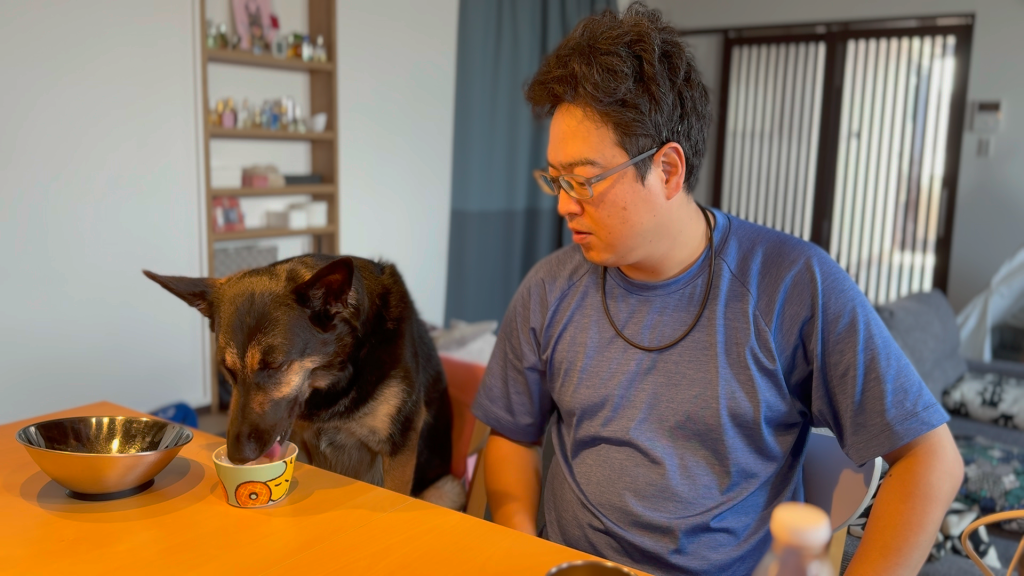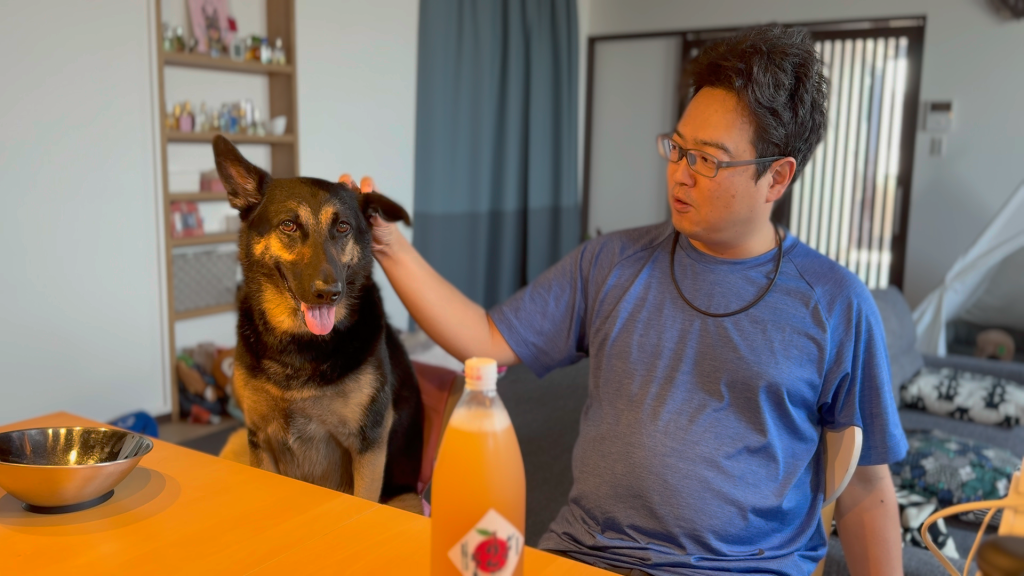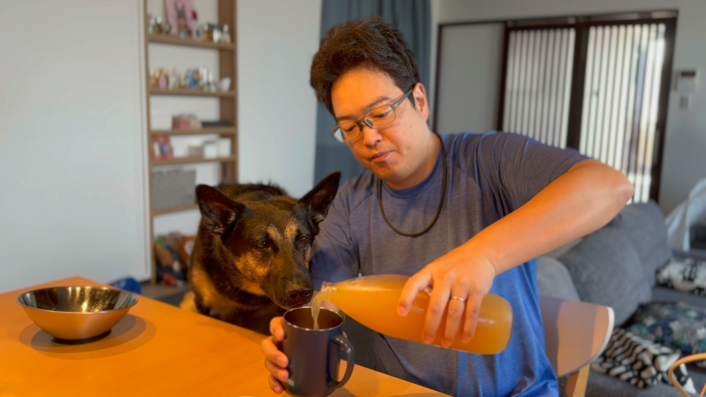 朝ご飯に愛犬も一緒に飲めるりんごジュース飲んだら、真剣な顔でレロレロが止まりません・・・。