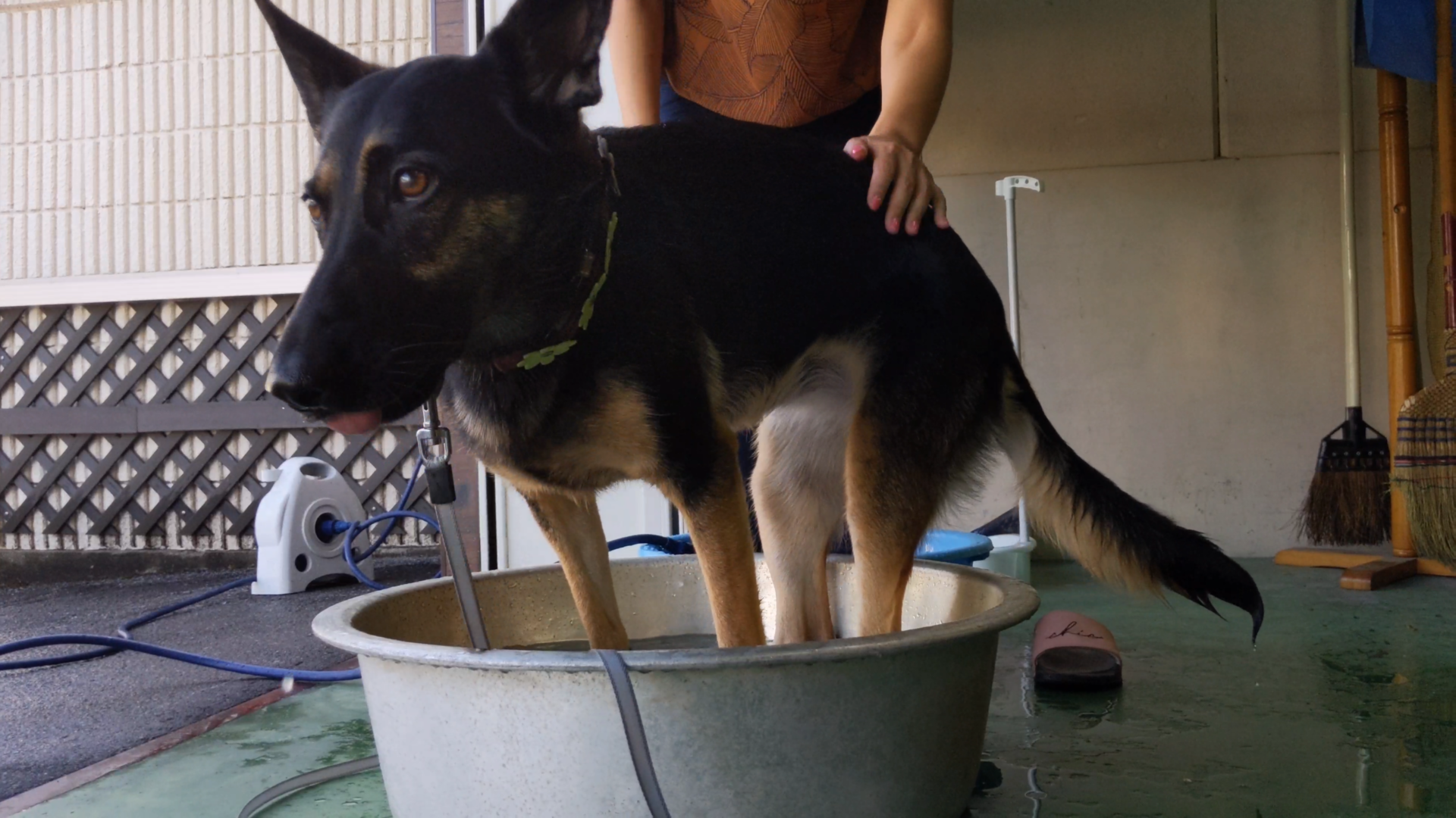 酷暑の夏をタライで乗り切る犬