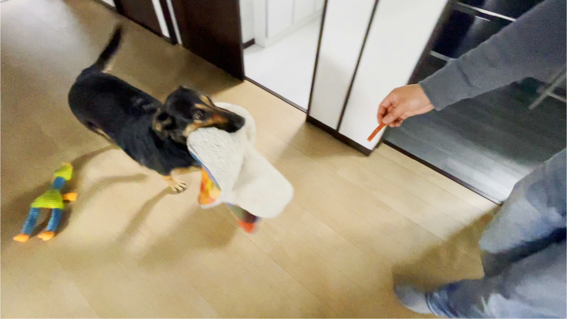 オヤツも欲しいけどお気に入りのモフモフマットを離したくない犬