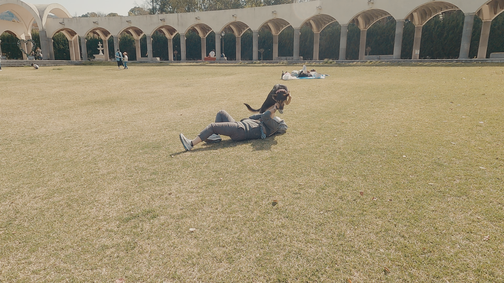 芝生で寝っ転がるとテンション上がってワンプロしてくる犬