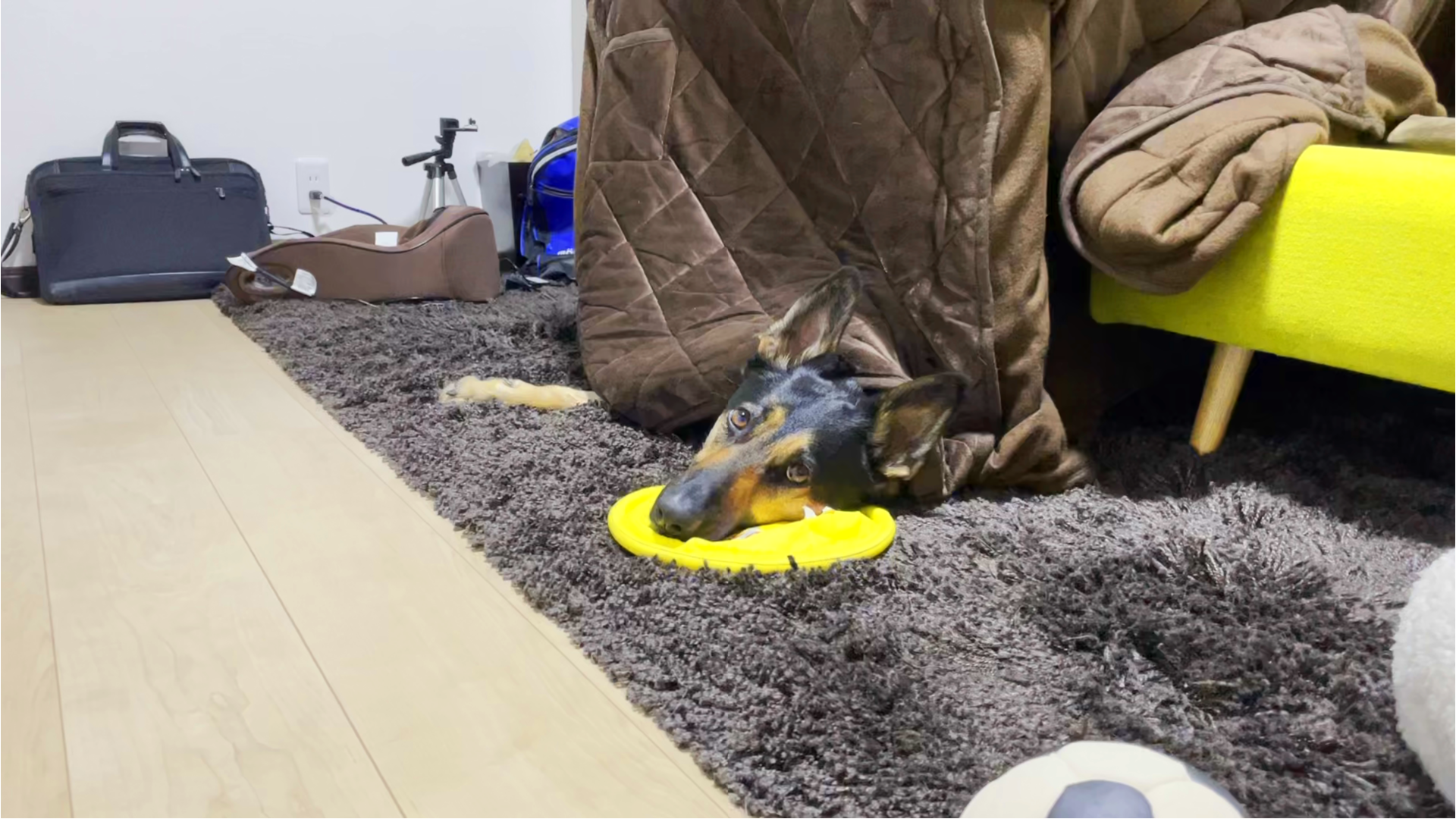 コタツを背負いながら、春の訪れを待つ犬