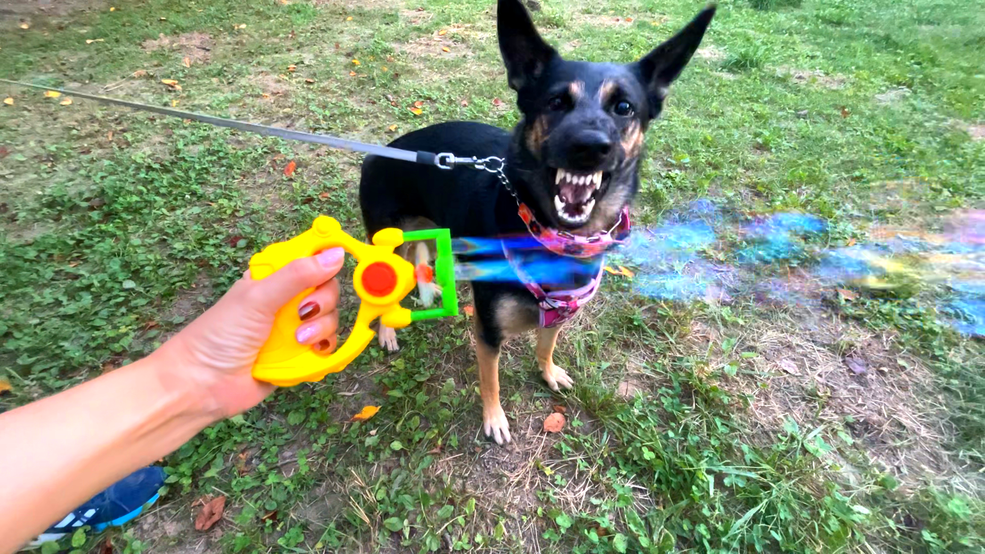 初めてシャボン玉を見たのでとりあえず食べることにしたシェパード犬