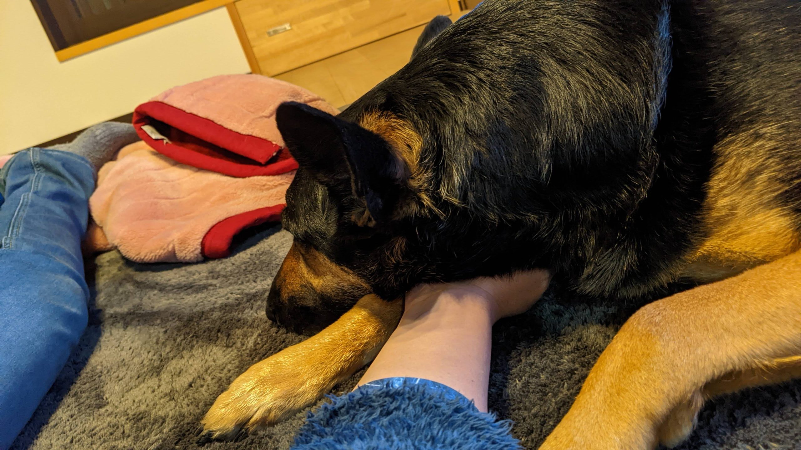 飼い主の手を枕代わりして寝る愛犬、手はしびれるし正直めっちゃ重いけどやっぱり可愛い・・・