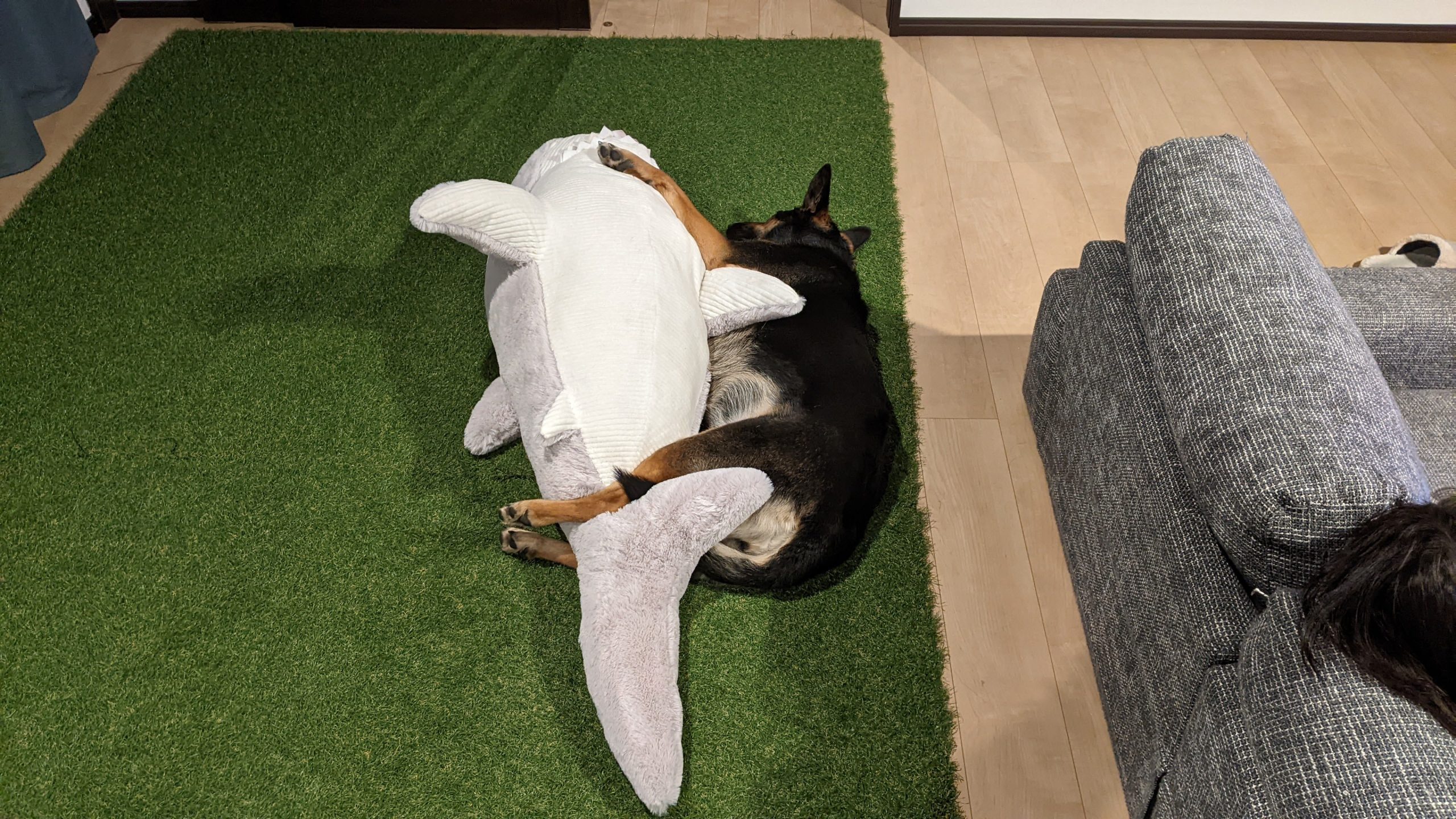 巨大なサメと抱き合いながら爆睡するシェパード犬、実はイカもほしい
