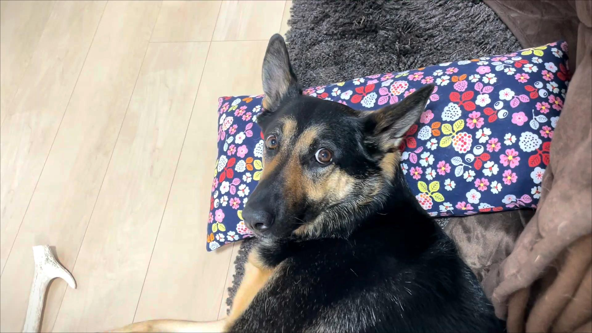 枕を使って愛犬が寝ていました。さて「枕が先か、維桜が先か」どちらでしょう?