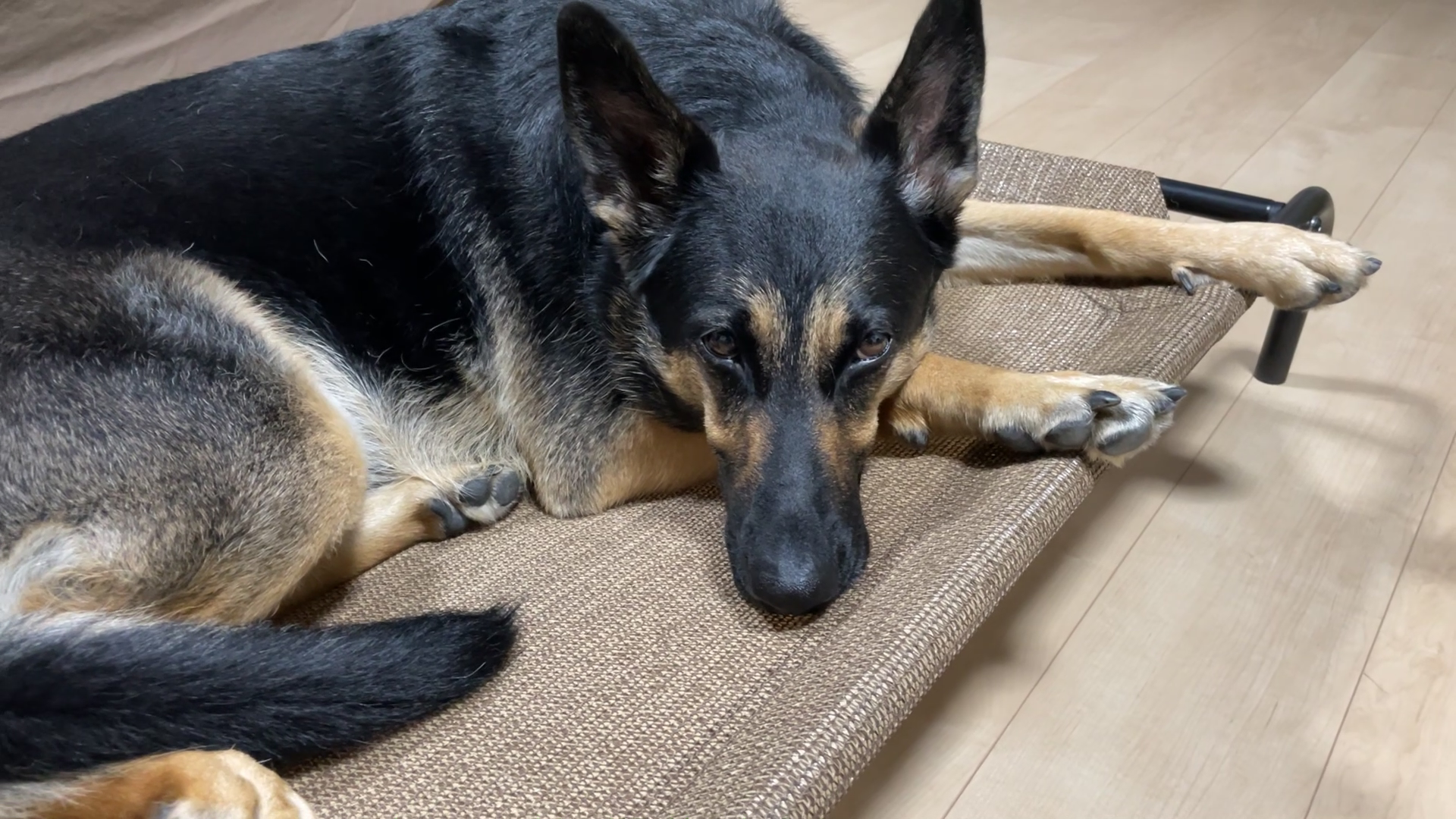 Amazonで買った茶色い筒が自分のものじゃないと分かったら、とりあえず寝室でふて寝する愛犬