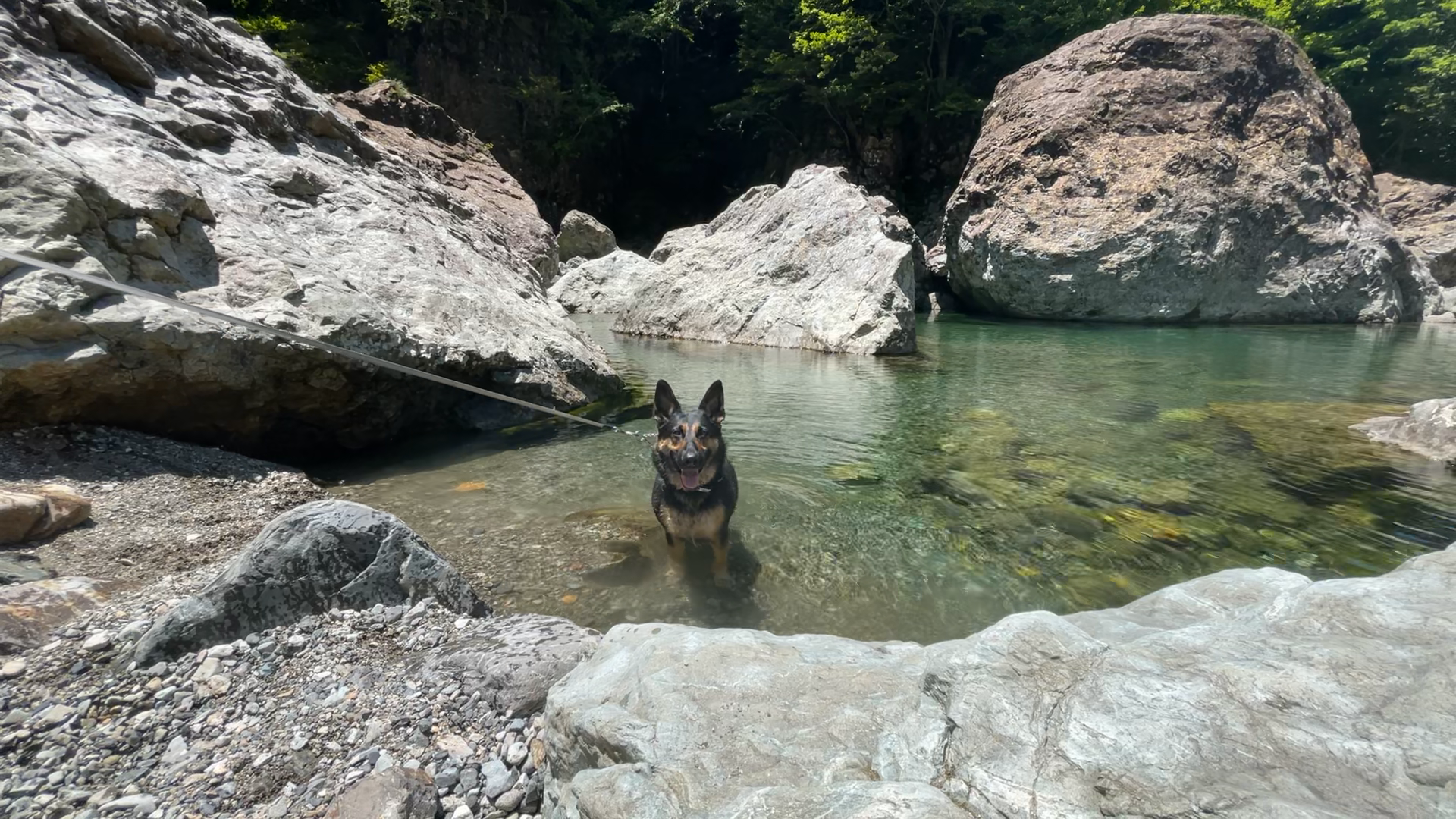 浅瀬でちゃぷちゃぷ川遊びするハズが、この後完全にスイマーになっちゃった犬