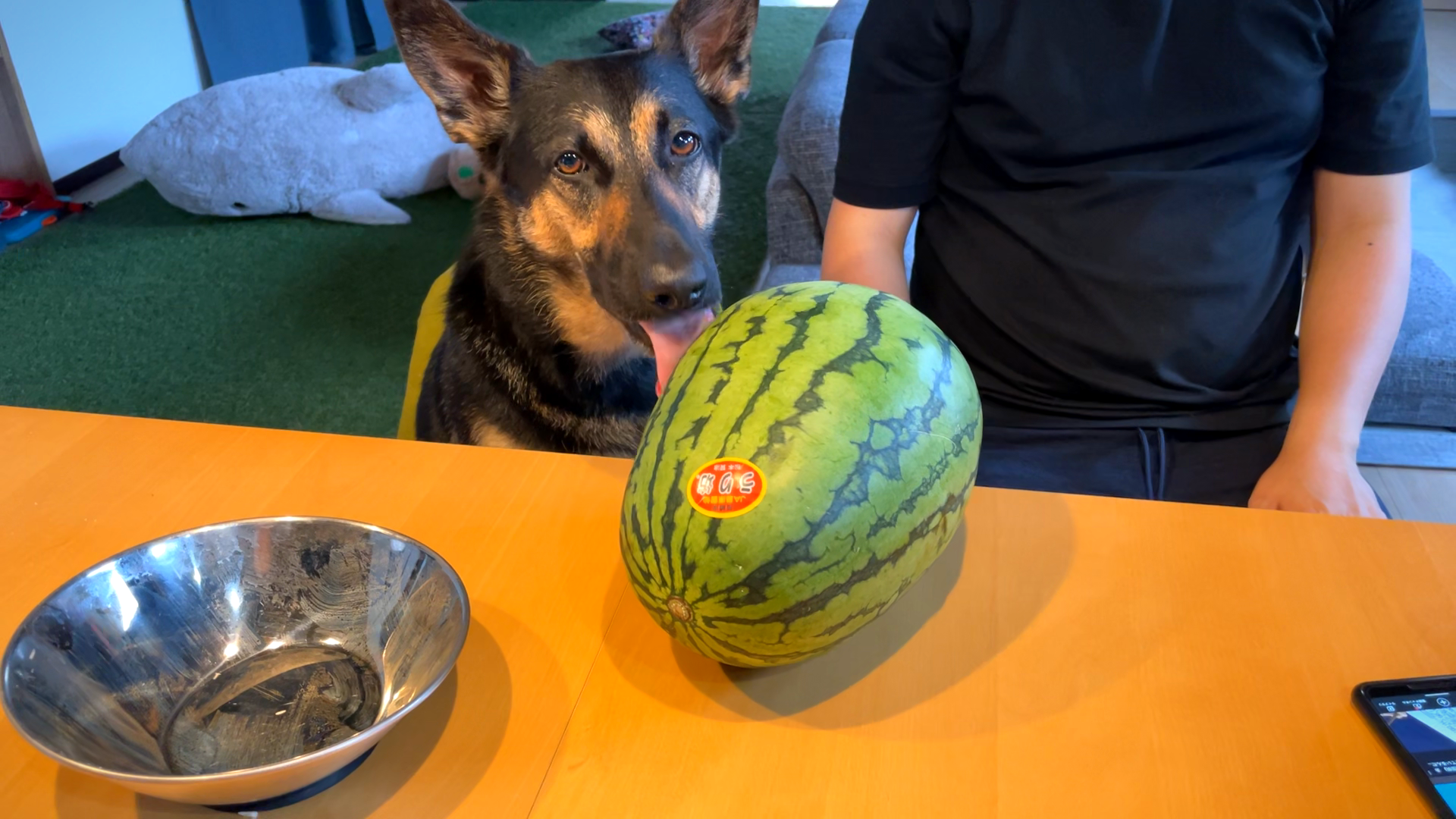 味見でもらったスイカを食べたのがバレた愛犬、口の中にスイカを入れたまま全力否定するw
