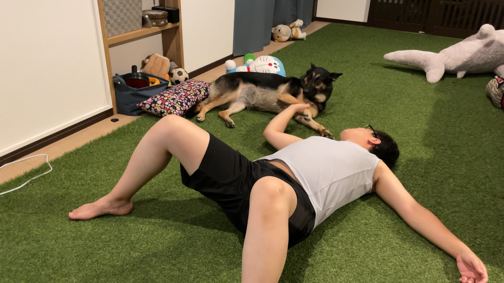 お風呂上りに一緒にくつろぎたい飼い主と、全力で遠慮するジャーマンシェパード