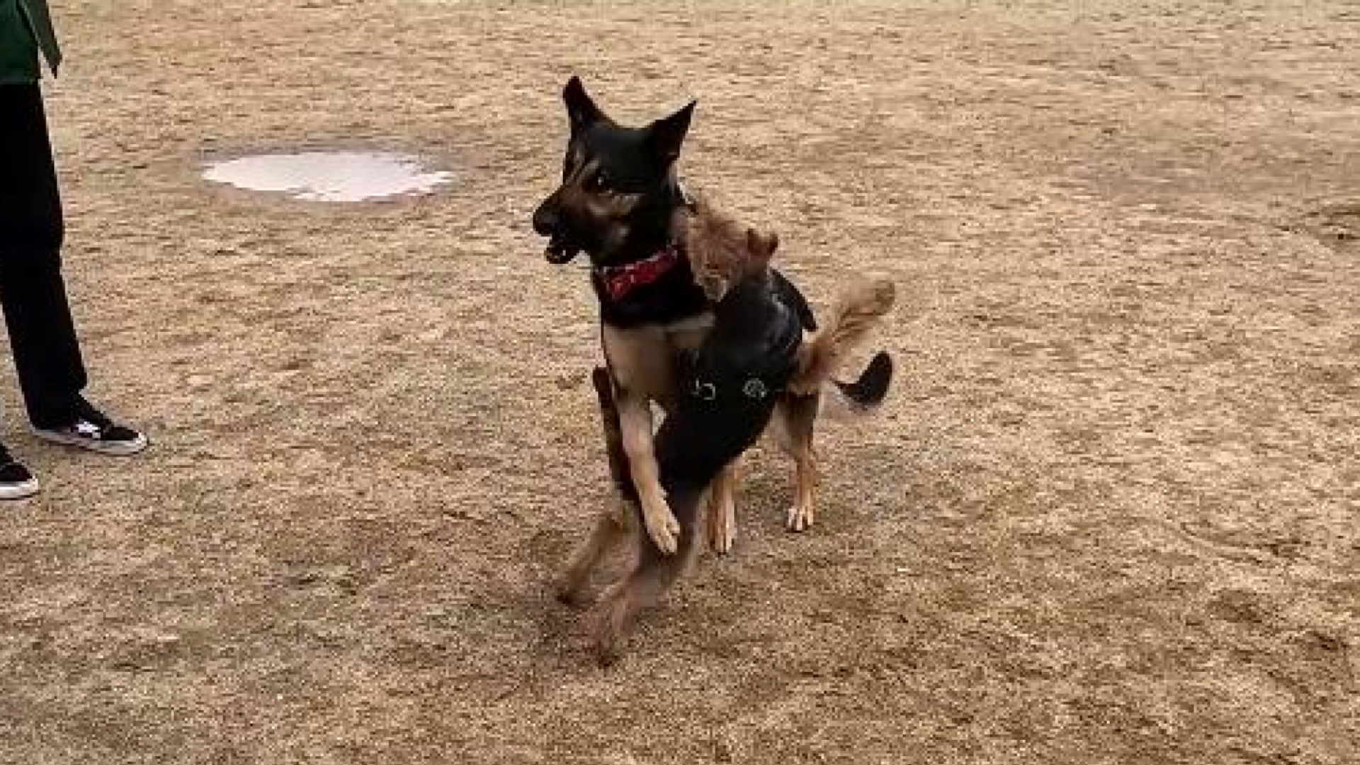 体の大きさは違っても、ワンちゃん同士が一瞬で仲良しになれちゃう瞬間!