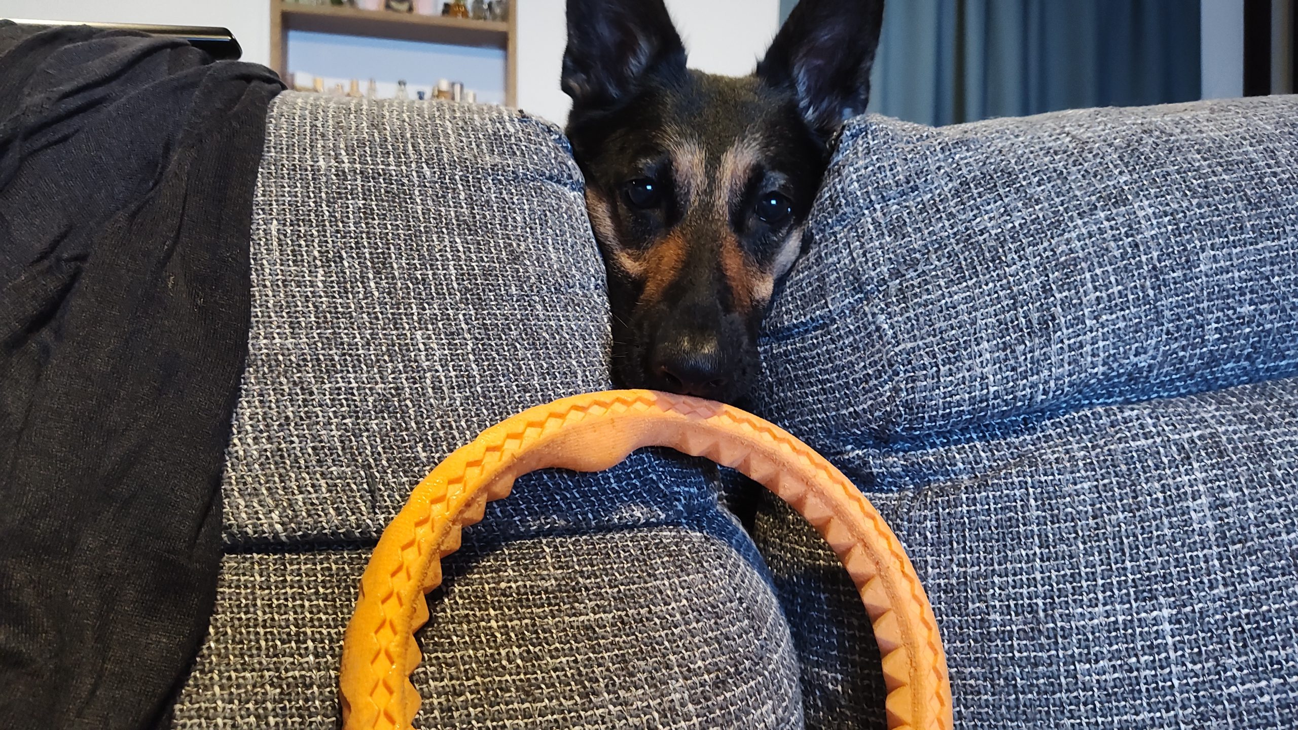 【ちょっと待って】暇な時だけオヤジを遊びに誘ってくるシェパード犬【ソファに顔挟まってるで】