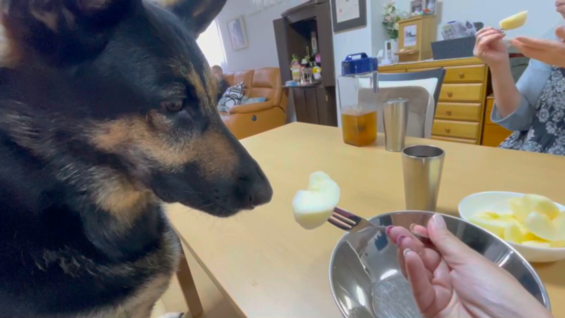愛犬が大好きなリンゴ!でも、普通にカットしても食べてくれません。こんくらいにしないと・・・