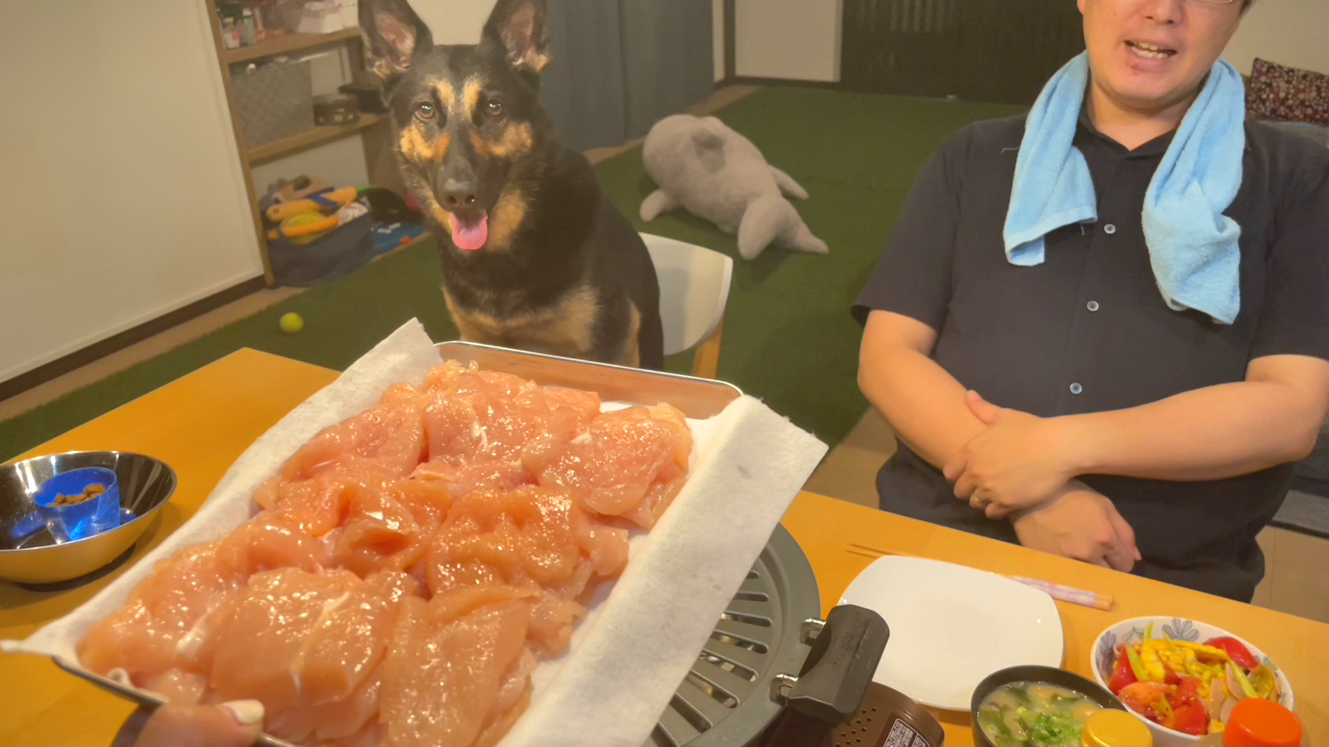 晩ご飯に鶏ささみで焼肉したら、愛犬が過去一の早食いをしでかしましたw