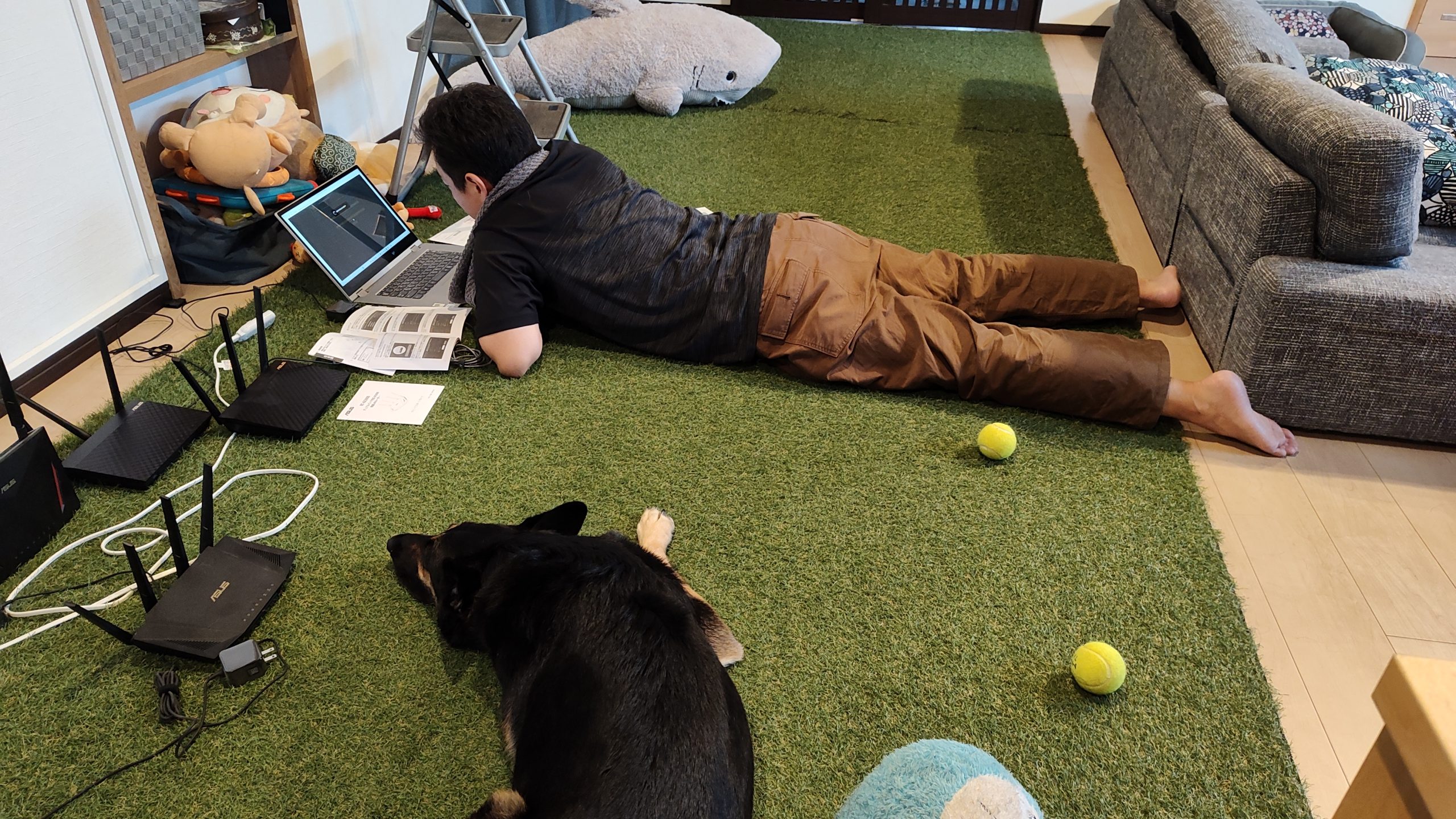 週末にWi-Fiルーターを新調したら、眠たくてたまらないのに設定に付き合ってくれる愛犬が可愛すぎたw