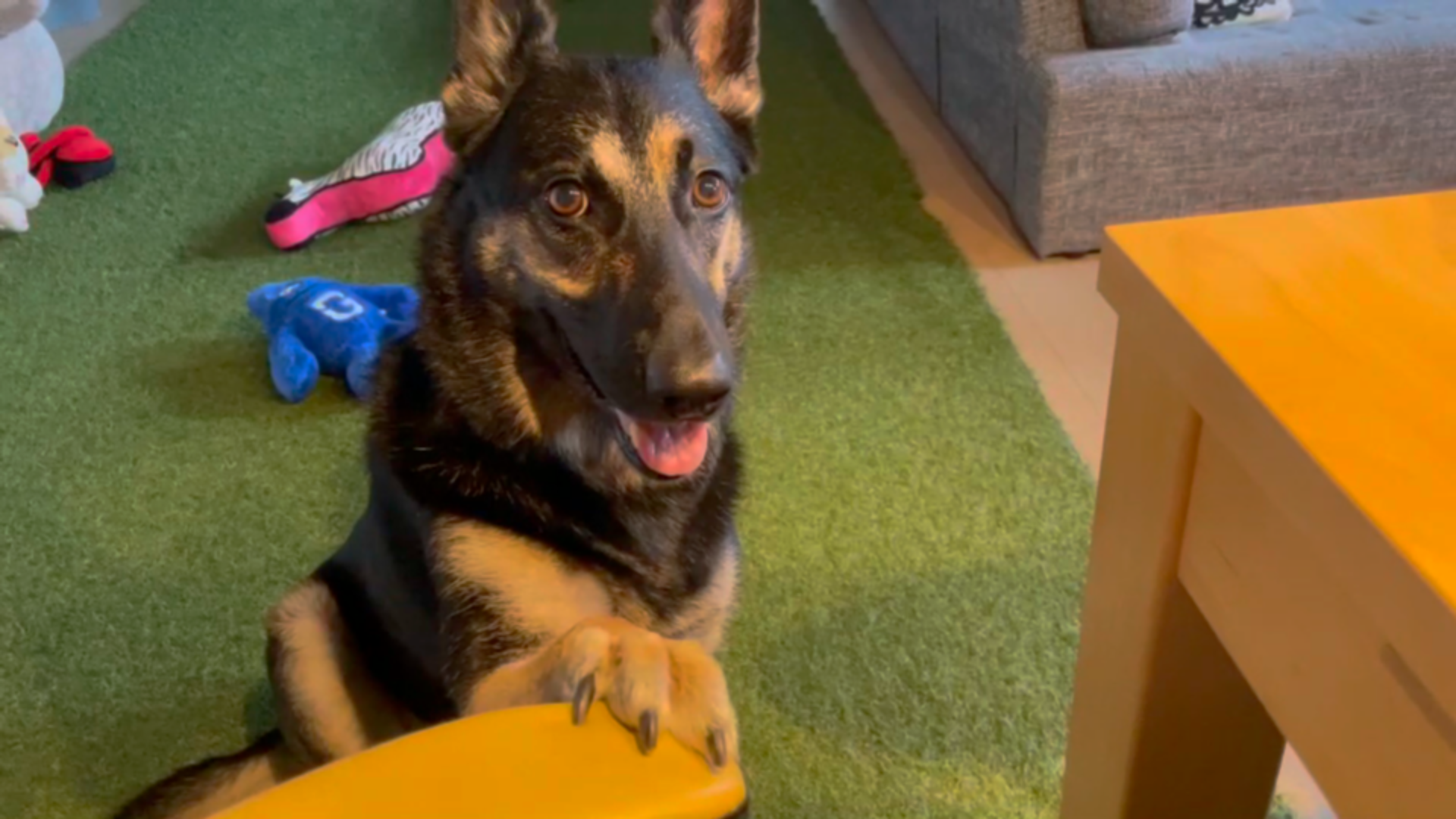 愛犬がイスのひじ置きにババーン!とお手してくるので、飼い主もお手で迎えたらこうなりましたw