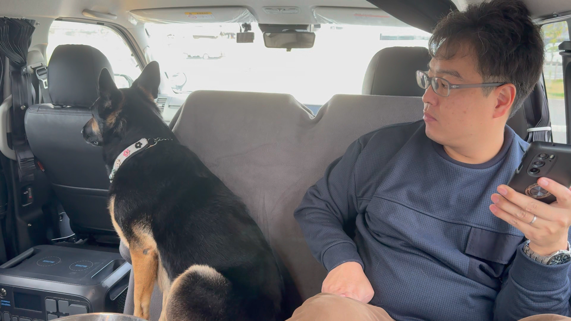 車内で愛犬と一緒に楽しく食事したハズなのに・・・。その後の愛犬とオヤジの距離がせつなすぎた
