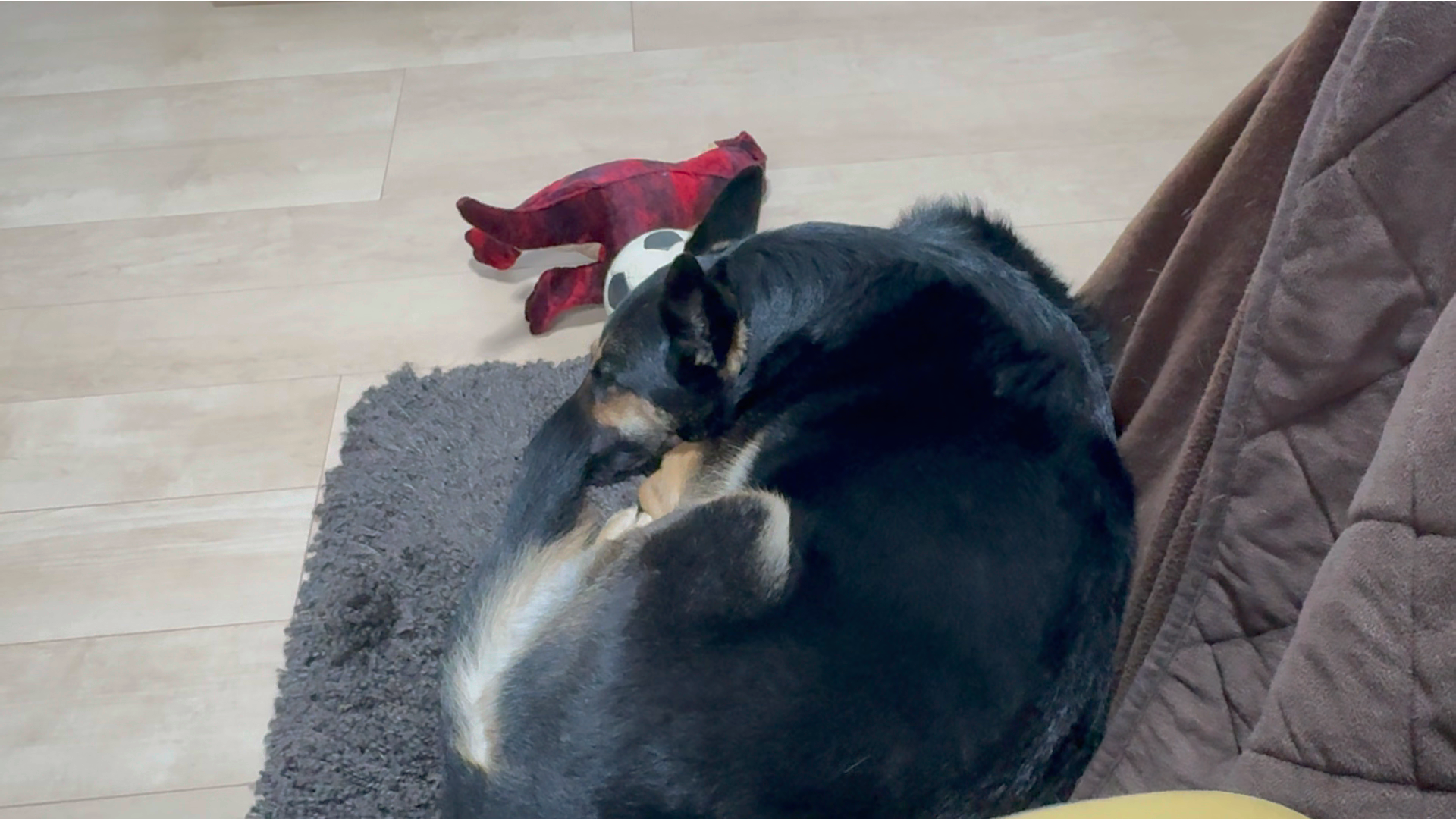 修理しようと思っただけなのに・・・。寝てる愛犬のそばからぬいぐるみを取ろうとしたらこうなります