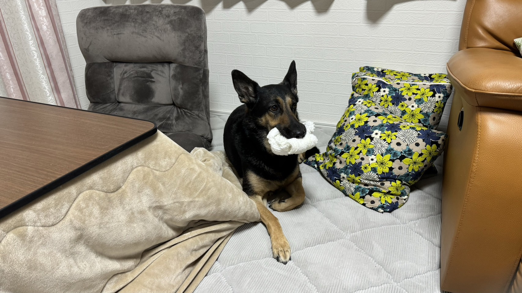 こんにちは。飼い主♀です。 今日は、実家に来ています。 「ほんひにはー!(訳:こんにちはー!)」 ご覧ください、維桜さんがくわえているもの! これ、たった今、台所からかっさらっていった手拭きタオルなんです。 (ブルーはオジジのネックウォ...
