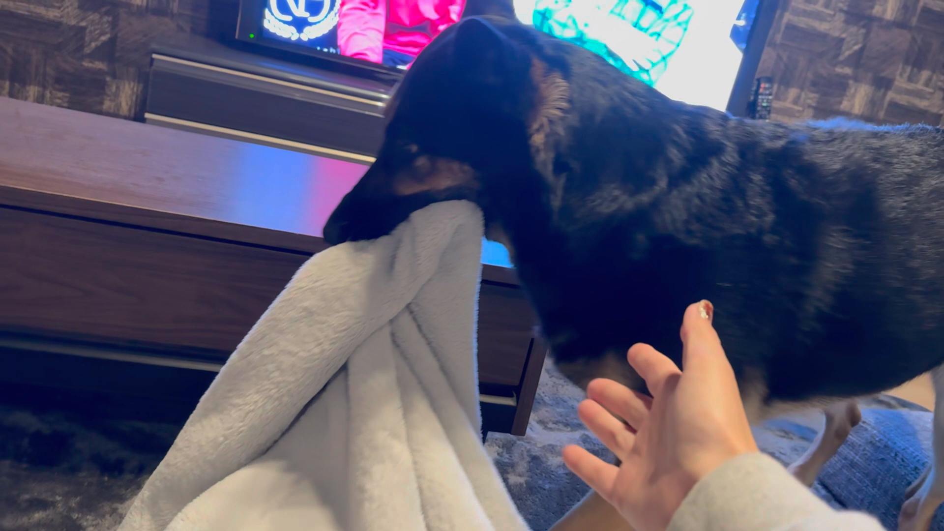 ひざ掛けしてたら、愛犬がやってきてガブッ!咥えて持って行こうとするのを止めたら、こんな顔してくる…