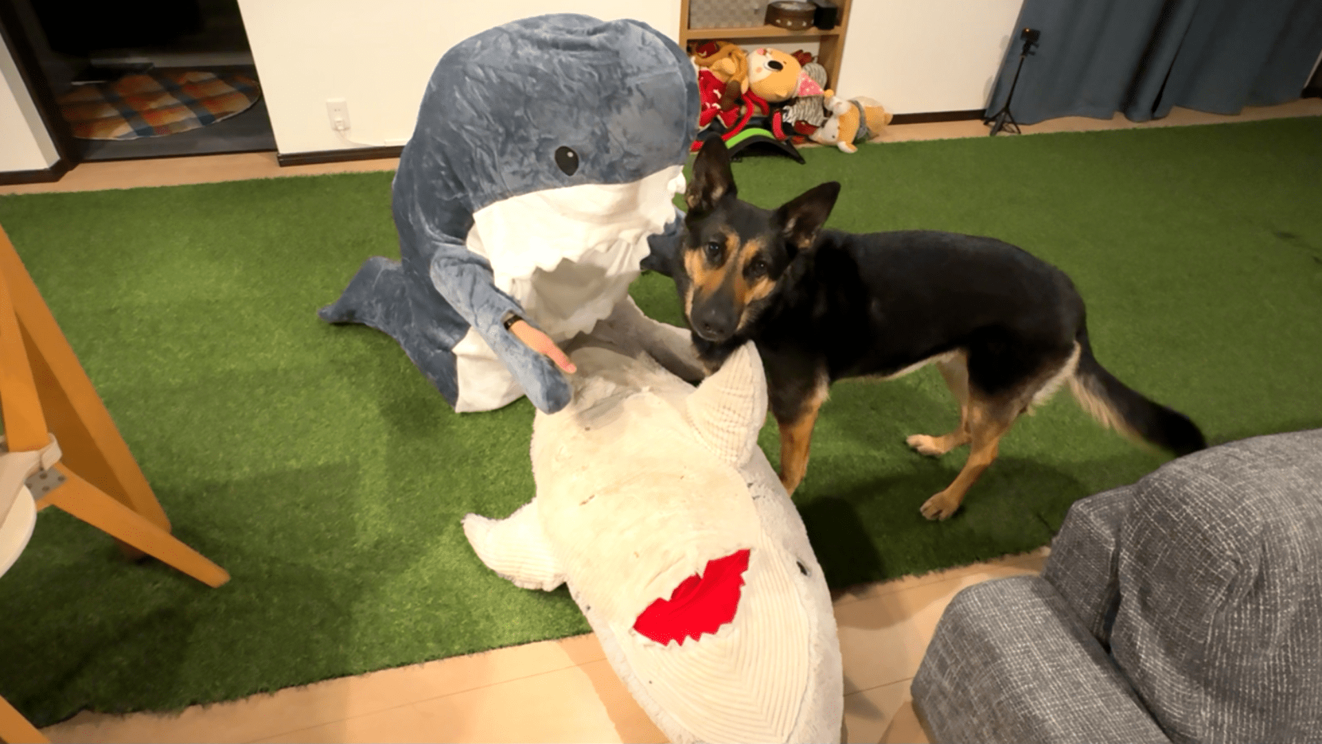 サメのぬいぐるみが大好きな愛犬の前に、着ぐるみを着た飼い主が登場したら・・・w