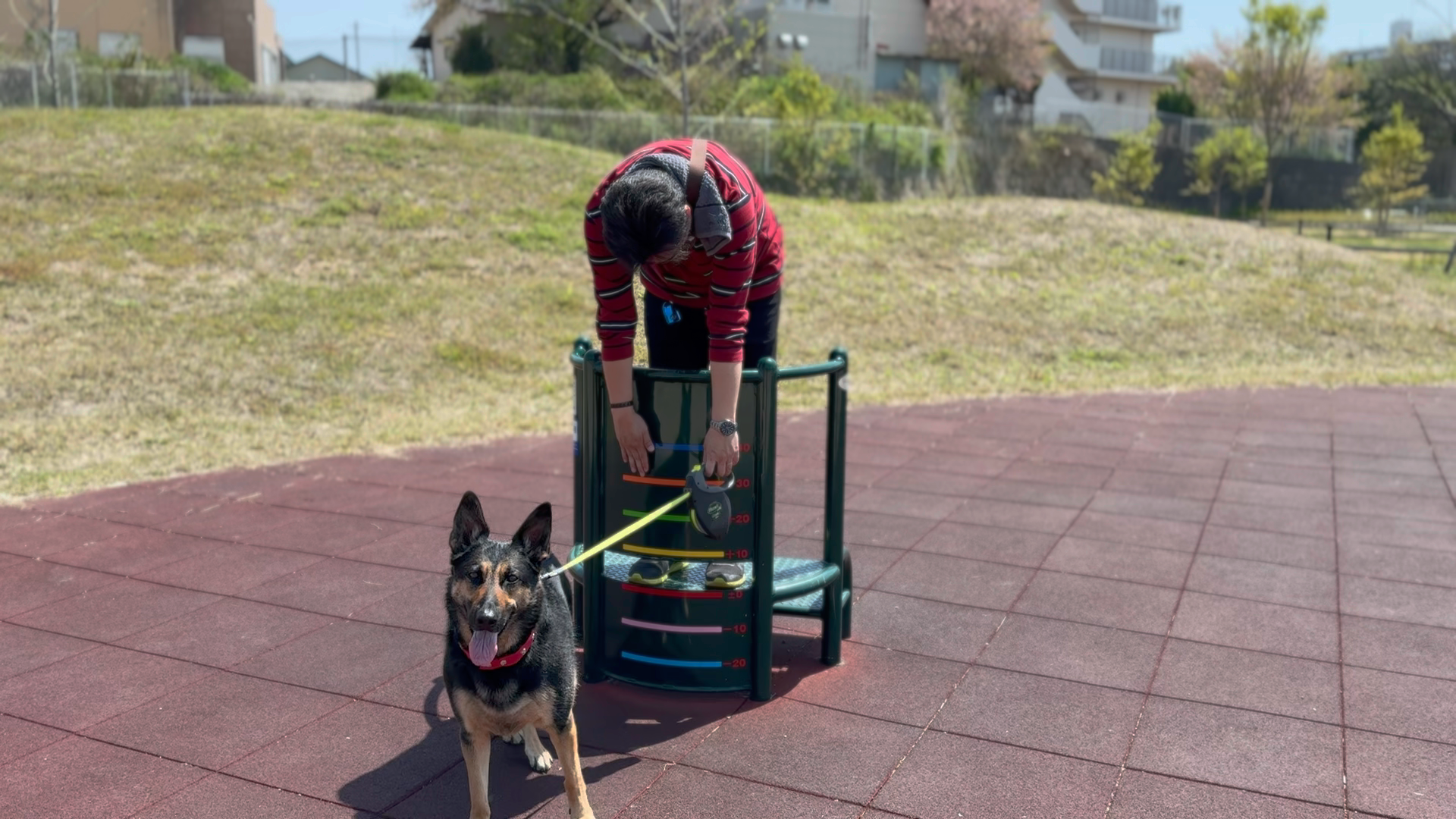 アラフォー飼い主、愛犬と公園を散歩中に見つけた健康遊具を結構ガチでやってみた結果・・・w