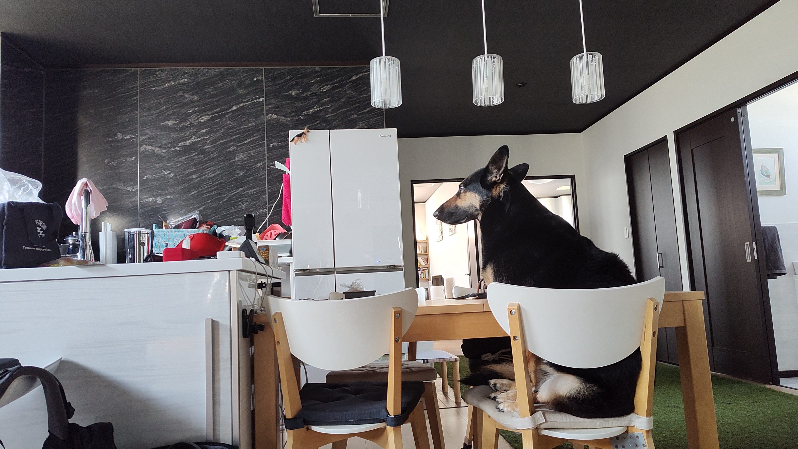休日の昼下がり、サッカー見ながらティータイムしようと思ったら、気配を察した愛犬が先にテーブルにいる説