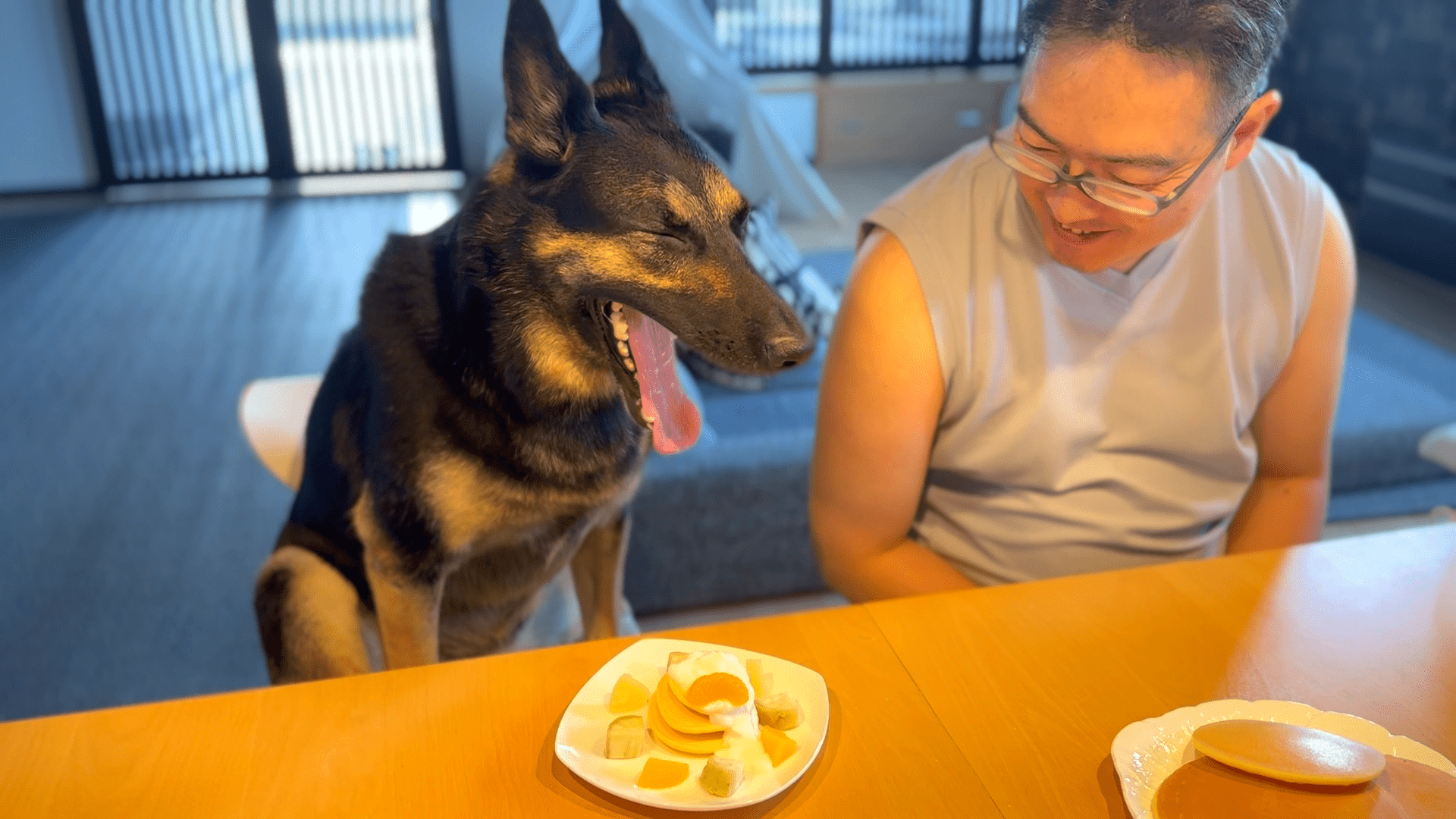 休日の朝食にオヤジがホットケーキ焼いたら、愛犬が食後5分経ってもおかわりのお手してくるw
