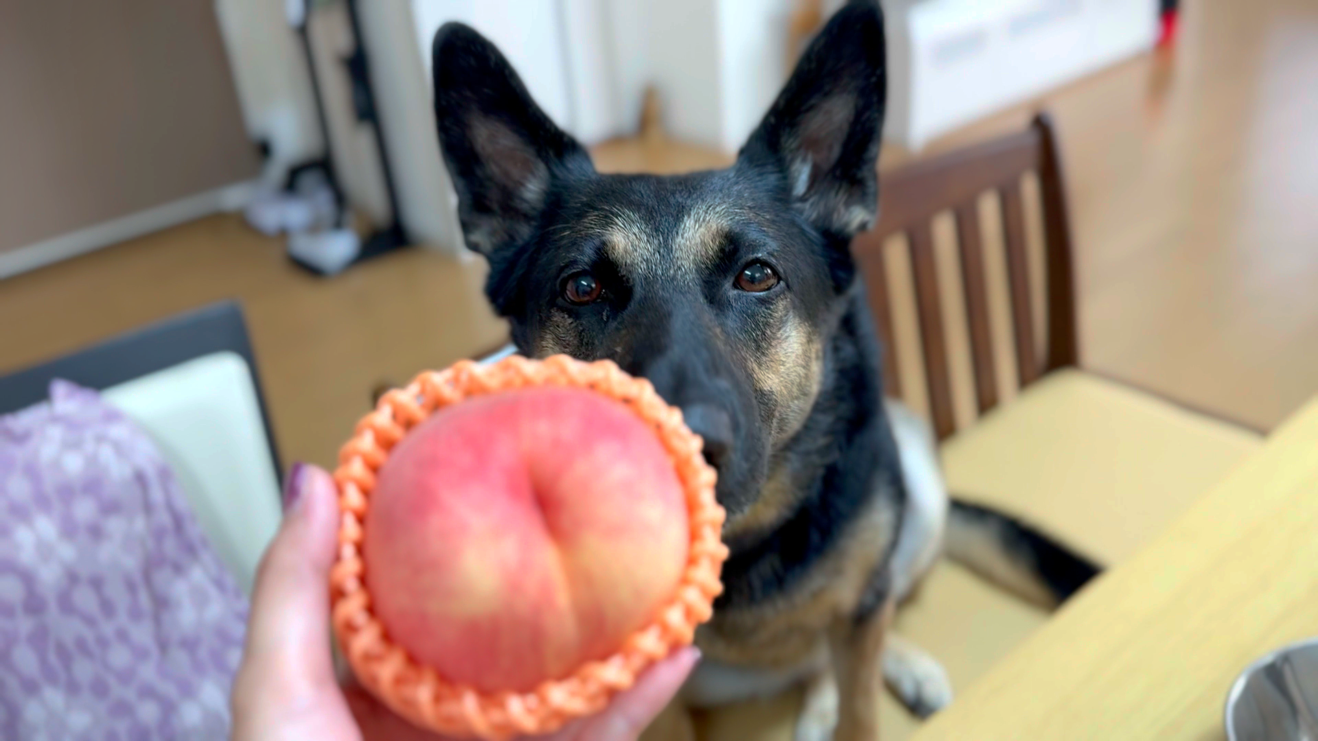 こんにちは。飼い主♀です。 今日は、実家にお邪魔しています。 「ちわー」 今日のオヤツに、オババが桃を買ってくれました。 山形県産の「秋桃華」という種類みたいです。 もう9月も半ばですが、今頃の時期でも桃が楽しめるんですね。 しか... -