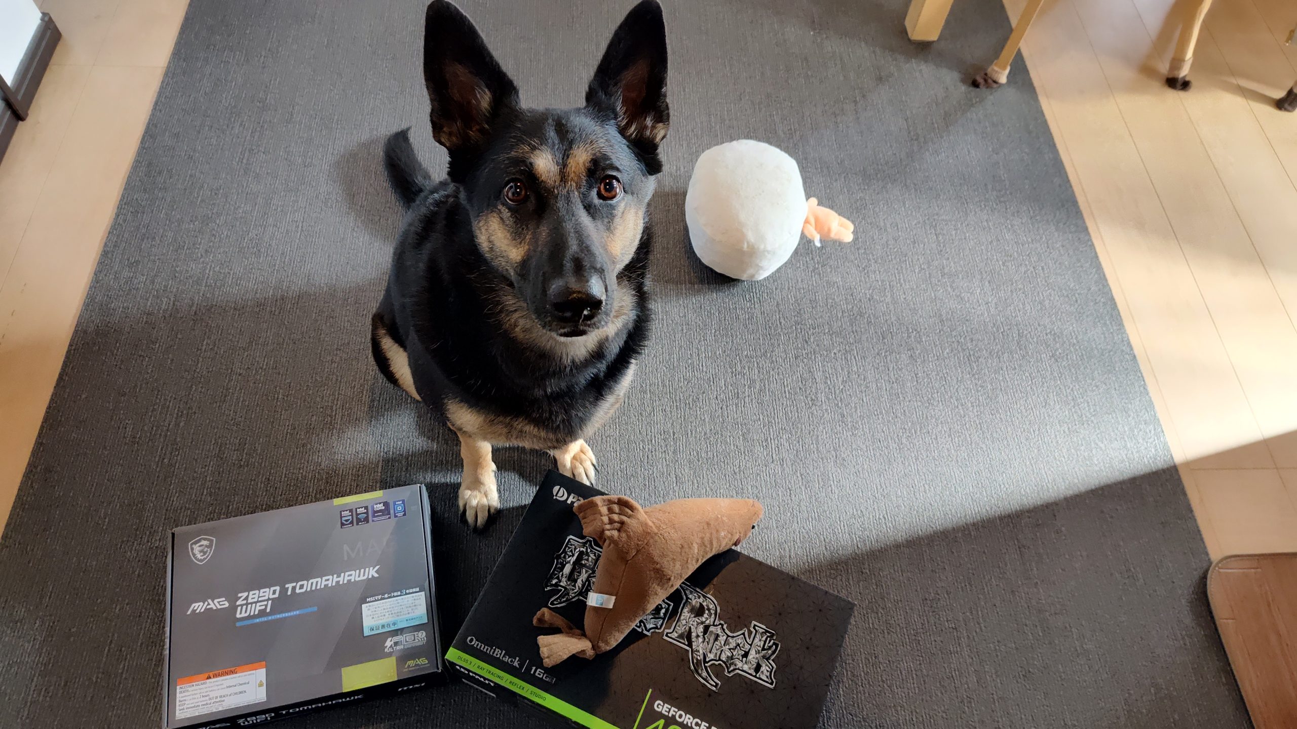 オヤジが一生懸命組み立てた自作パソコンなんてどうでもいいからオヤツくれって言ってくる愛犬がこちらです