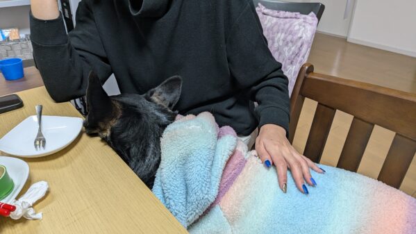 もう何も食べるものはないと思ったのか、ママ様の膝の上を借りて寝てしまいました😊