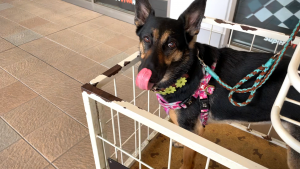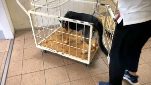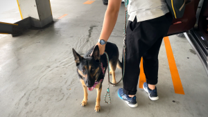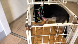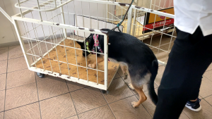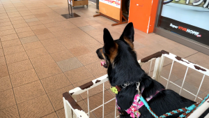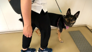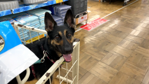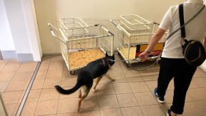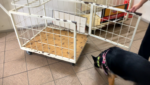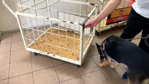 最初のうちは、他のワンちゃんのにおいがするカートに乗るのをためらっていましたが、何度も連れていっているうちに、カートに自分から乗ってくれるようになりました。