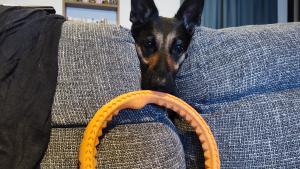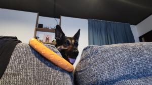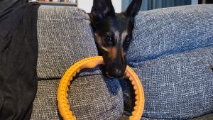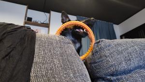 輪っかを引っ張ってほしい維桜さん、ソファーに顔を突っ込んでおねだりしてきます。