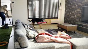 オヤジは扇風機の掃除を、私(飼い主♀)は掃除機をかけています。
