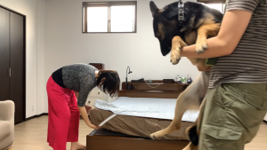 ベッドメイキングを邪魔する犬