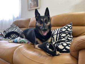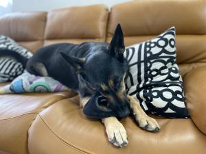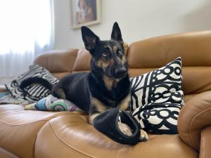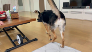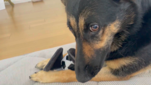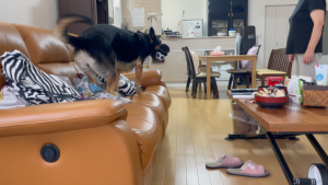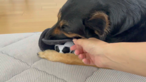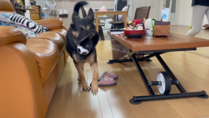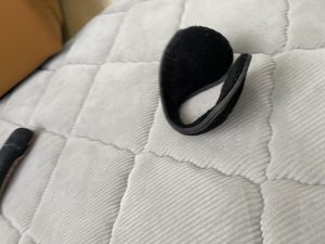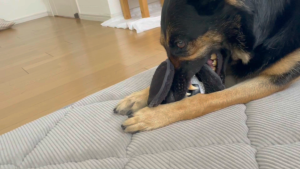 どこかに置いてあったイヤーマフをくわえて来て噛んでいたようです。