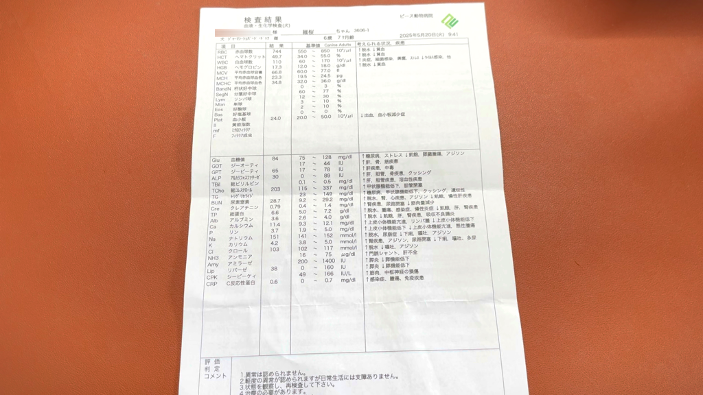 念のため、最後に出した血便を持参したところ、獣医さんも心配して血液検査をしてくれました。