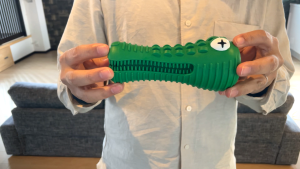 こうやって、ワニの口に歯磨き粉を塗ると、ワンちゃんがセルフで歯磨きできちゃうんですー!