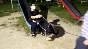 オヤジが「ちょっと休憩」とすべり台に腰かけました。