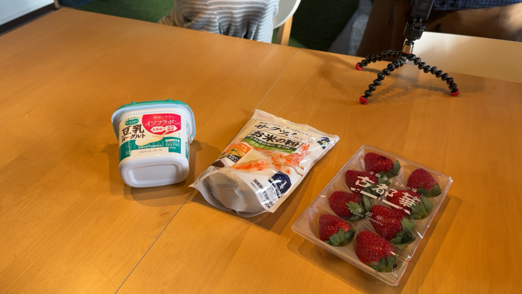 それでは、こちらの材料(豆乳ヨーグルト、米粉、いちご、
