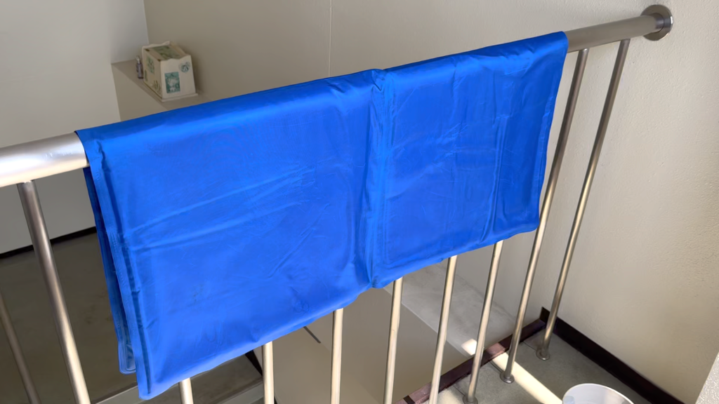 その後、浴室乾燥3時間した後に、8時間換気、その後、こちらでほぼ天日干し←今、ここw