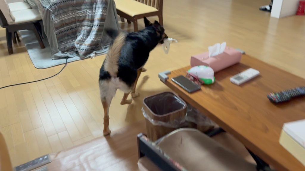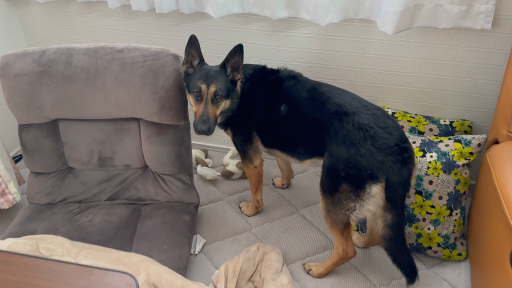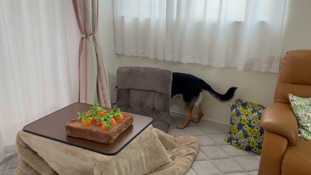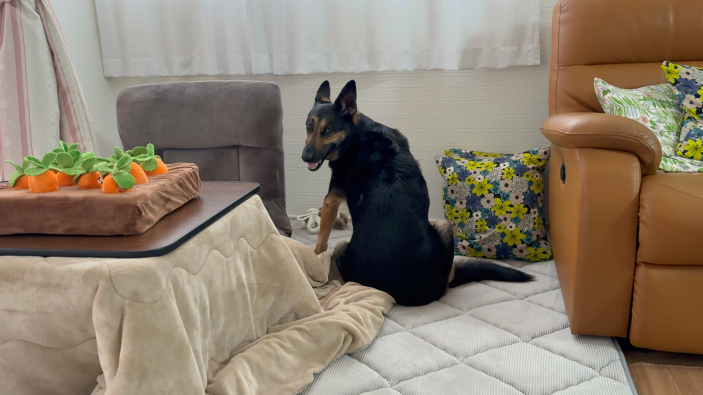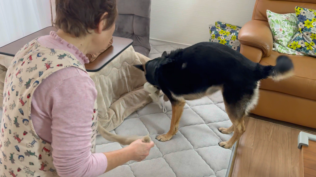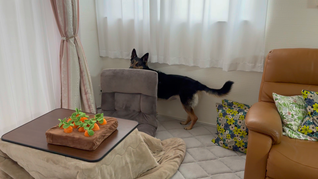 オババに追い詰められた維桜さん、座椅子の後ろに隠れてしまいました。