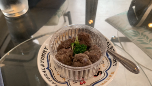 Dog Cafe ピエロさん名物の馬肉団子(紫いも入り)と、
