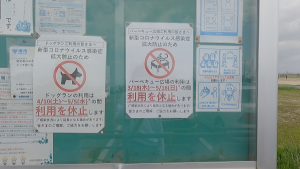 今日は車でブィーンと堺市にあるドッグランへ遊びに来たのですが、なんとコロナの影響で利用休止になってました!