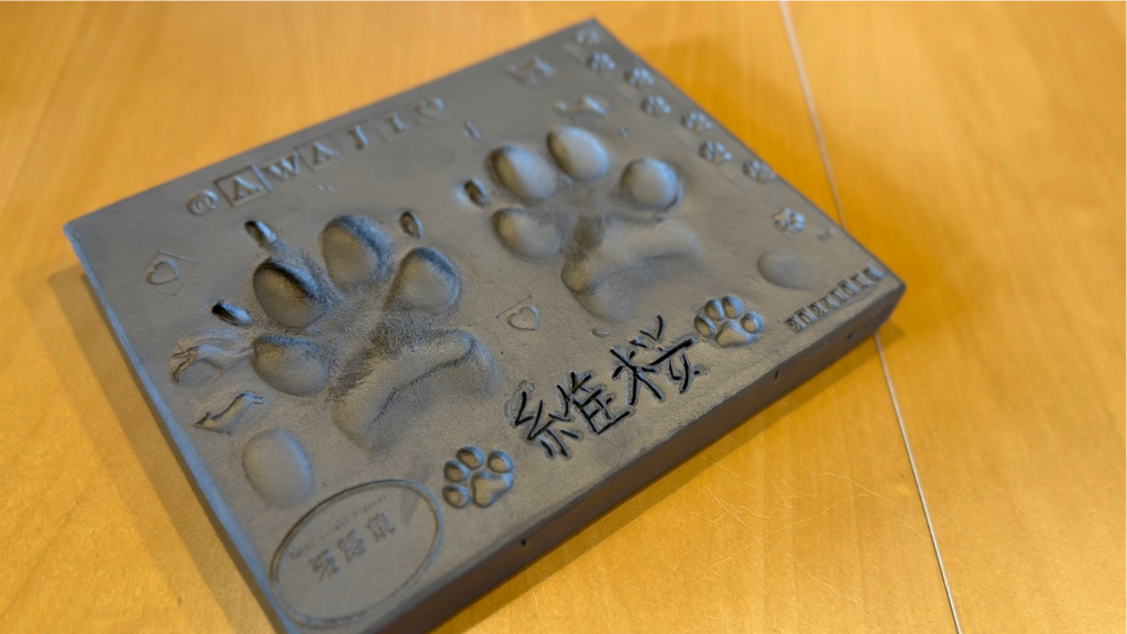 こちらで、ワンちゃんの手形を瓦にする体験をさせてもらいました。