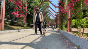 維桜さん、ご機嫌にミニバラのアーチをくぐっています。