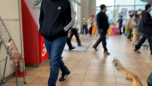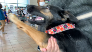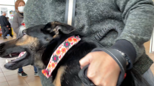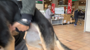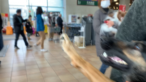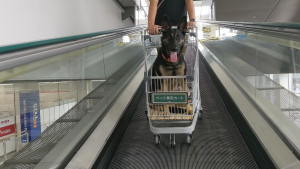 ※飼い主♀が手で押さえていたので、カートは他のお客さんの邪魔にはなりませんでした。セーフ!
