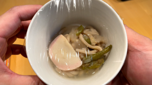 あらやだ、ピンクのカマボコに、花形に細工切りされた人参まで入っているではありませんか。