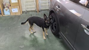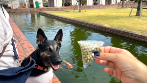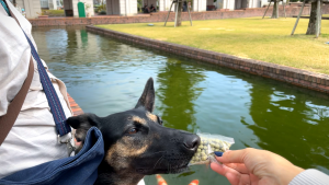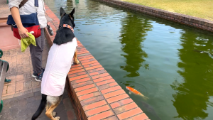 シェパード犬の前で鯉にエサをあげたら、キュンキュンが止まりません