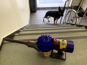 「ちょっとー飼い主ぃ、掃除機してないでボール投げてよねー? わっ、足元にほこりあった!」