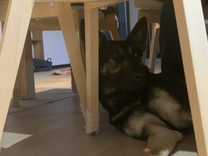 「机の下ですねてやるんだから! あ、またほこり見っけ。掃除機やり直しね」